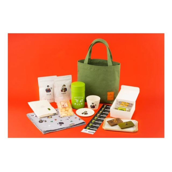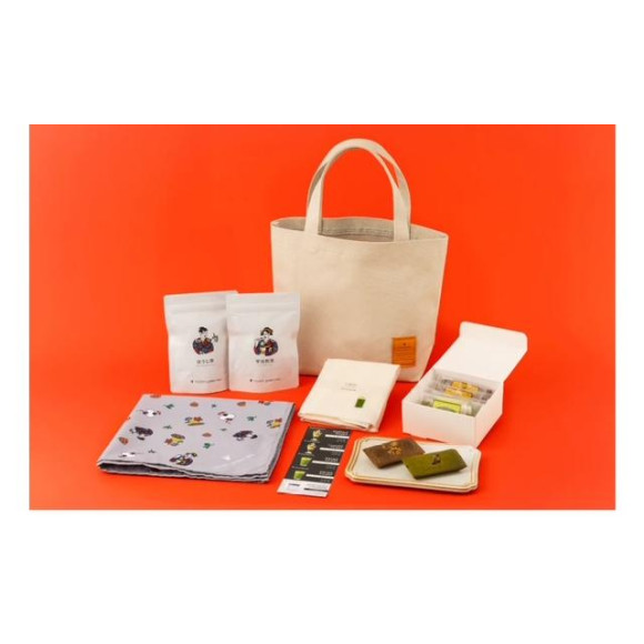 毎日の生活の中でお楽しみいただけるオリジナルグッズとお茶菓子、店舗でご使用いただけるギフトカードのセットです。