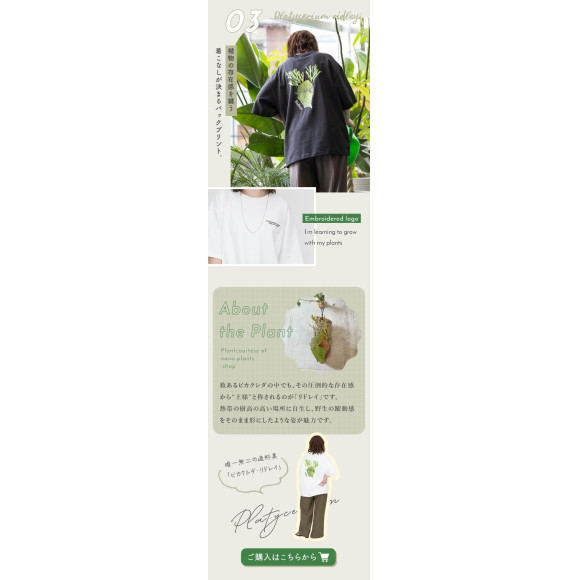 ・バックには、Saori Ohwada氏の手によって精緻に描かれた「ビカクシダ・リドレイ」をダイナミックにプリント。