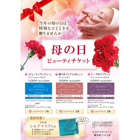 〈エステサロンさくら〉では、大切な奥様・お母さま・ご友人へのプレゼントにおすすめのギフトチケットを3種類ご用意しております。